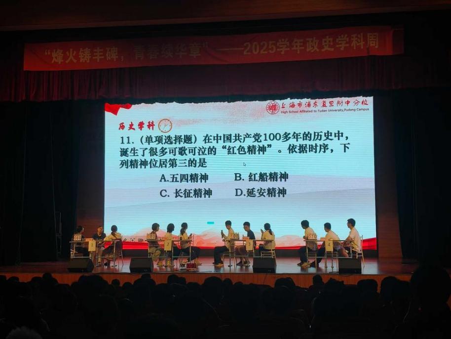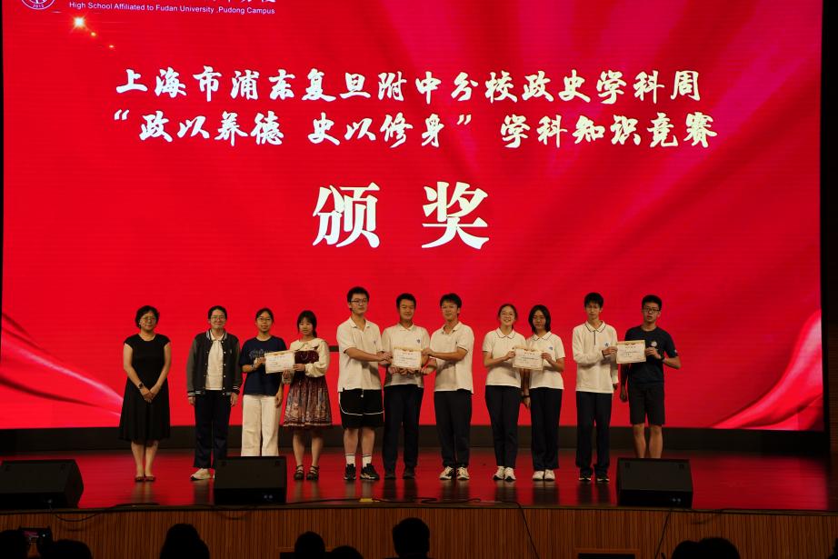 在“政以养德,史以修身”政史知识竞赛中,高二学生以班级为单位积极参与,经初赛选拔,最终四支队伍入围决赛。决赛试题知识覆盖面广、考查维度多元。在必答题环节,各班选手面对难题沉着应对,用精彩的表现点燃了台下同学的热情,赢得了一次次热烈的掌声。抢答题环节现场亮点频现:“线索猜历史事件/人物”环节中,选手们根据线索激烈竞猜,台下同学也同步投入思考,全场沉浸在“以史解谜”的趣味氛围中;音频题环节中,一首首悠扬的歌曲颇具时代特色、引人入胜,也曾出现台上选手一时思索未决,台下同学踊跃答出的精彩瞬间,大报告厅内气氛持续高涨。经过激烈角逐,高二(6)班最终斩获一等奖,高二(7)班获二等奖,高二(2)班、高二(3)班获三等奖,充分展现了高二学子扎实的政史学科素养,副校长朱晓卉老师为获奖班级颁奖。