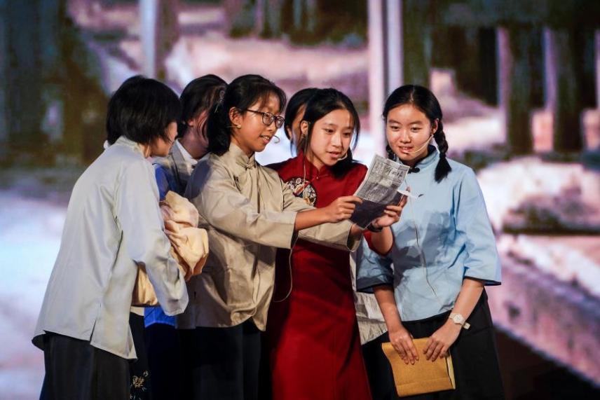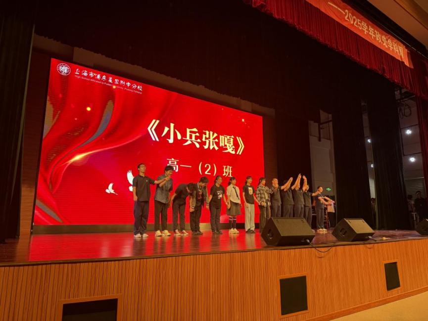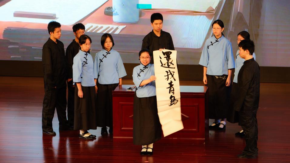 高一(2)班的同学们呈现《小兵张嘎》配音,诠释少年英雄的机智果敢和孩子气,表现可爱可敬的少年报国志气,以儿童为切入点,活泼中带领观众们体会深入人心的抗战精神。