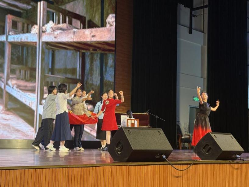 最后,高一(1)班演绎了《绣红旗》片段,演绎经典形象,再现狱中革命者对新中国的热切期盼,随着《绣红旗》的音乐响起,特殊的“五星红旗”蕴藏着滂沱的情感,舞步之间讲述以江姐为代表的千万英雄的故事。