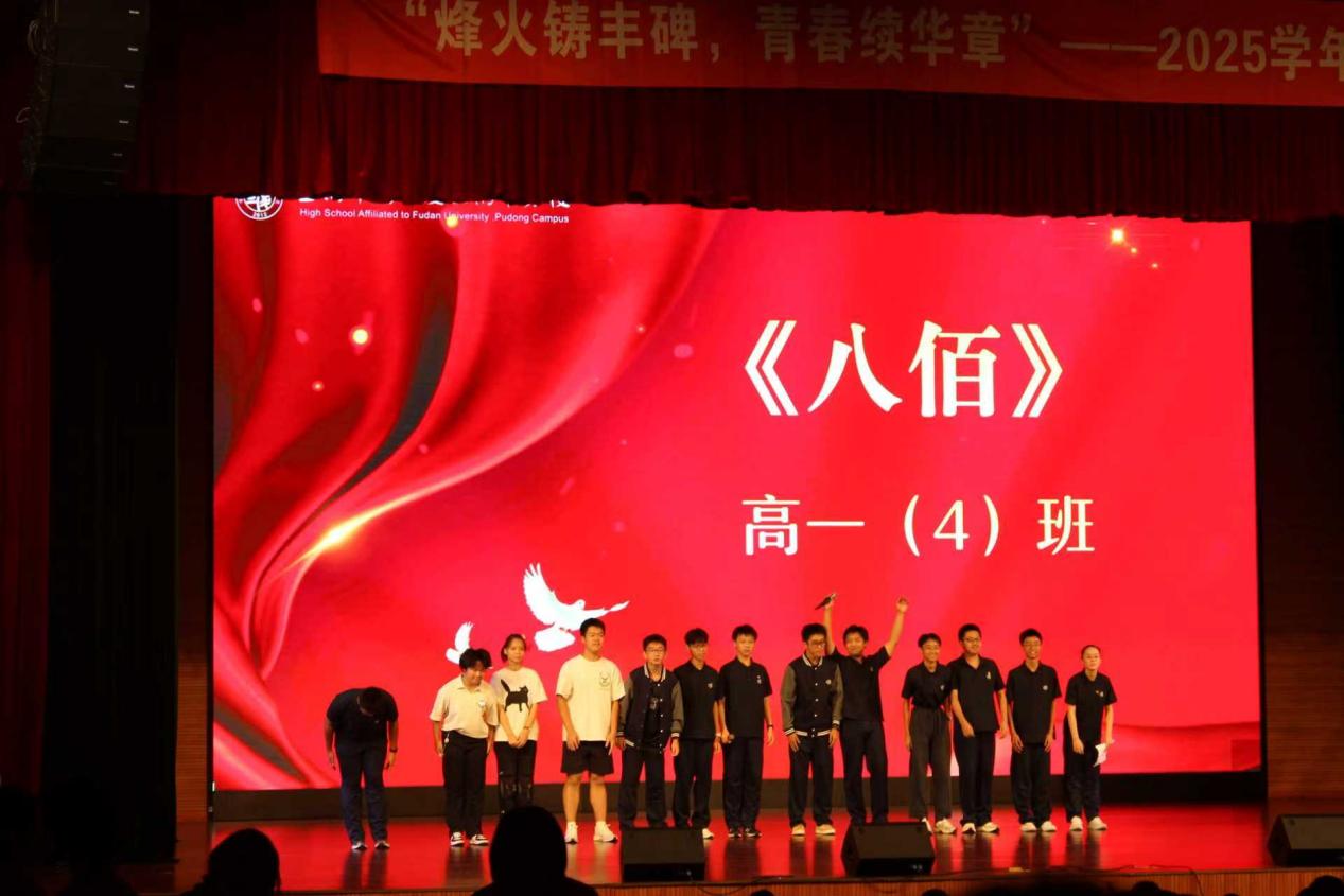 接下来是高一(4)班带来《八佰》电影配音,运用亲切的地方方言,聚焦战场,体现了中华民族在危难时刻的团结一致、不畏牺牲,致敬四行仓库的英雄壮举。