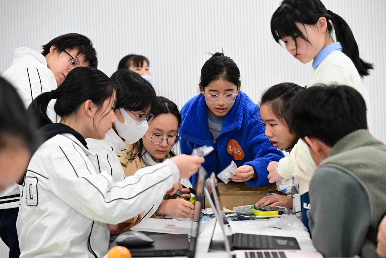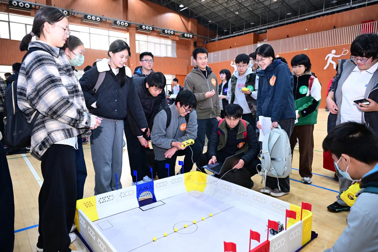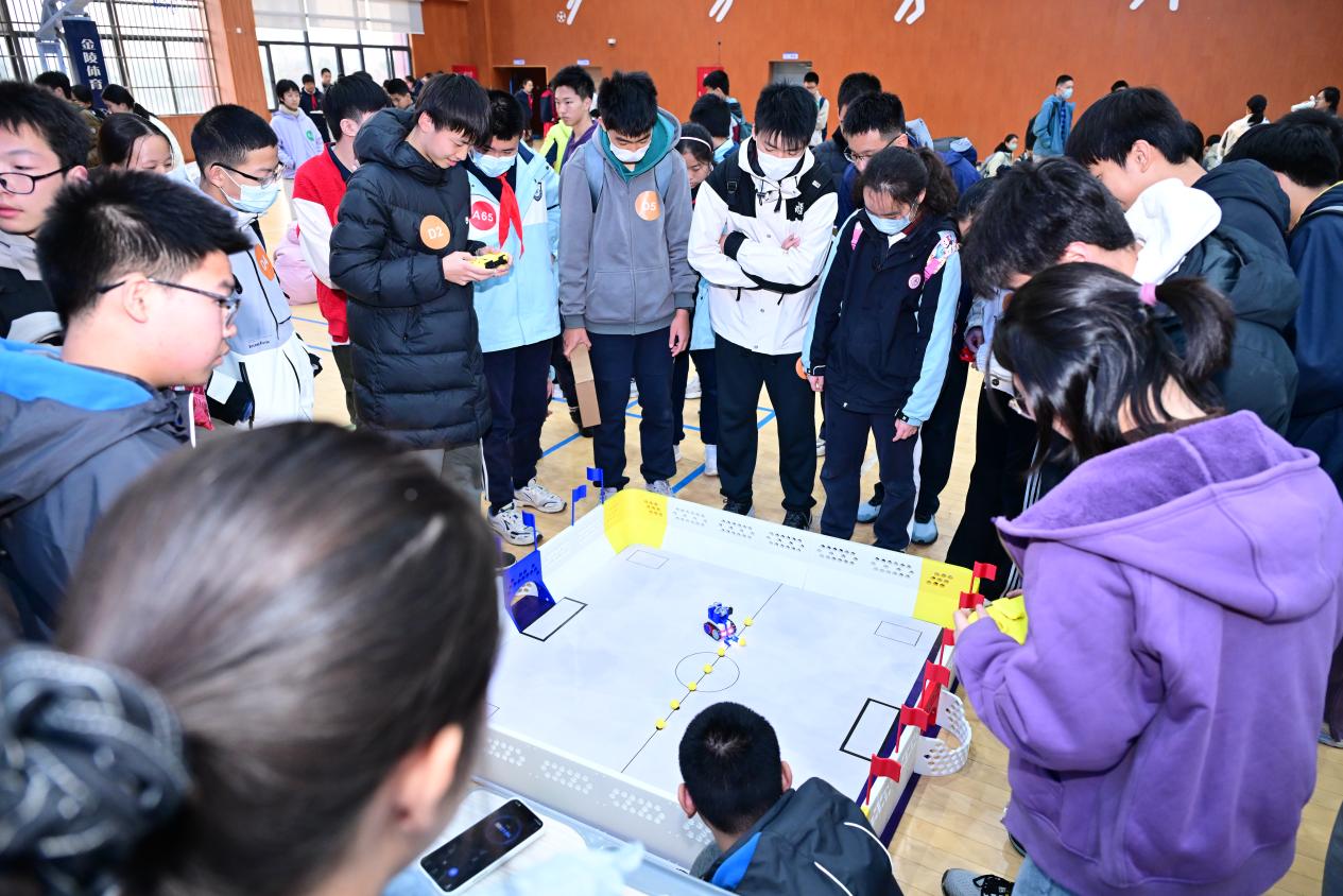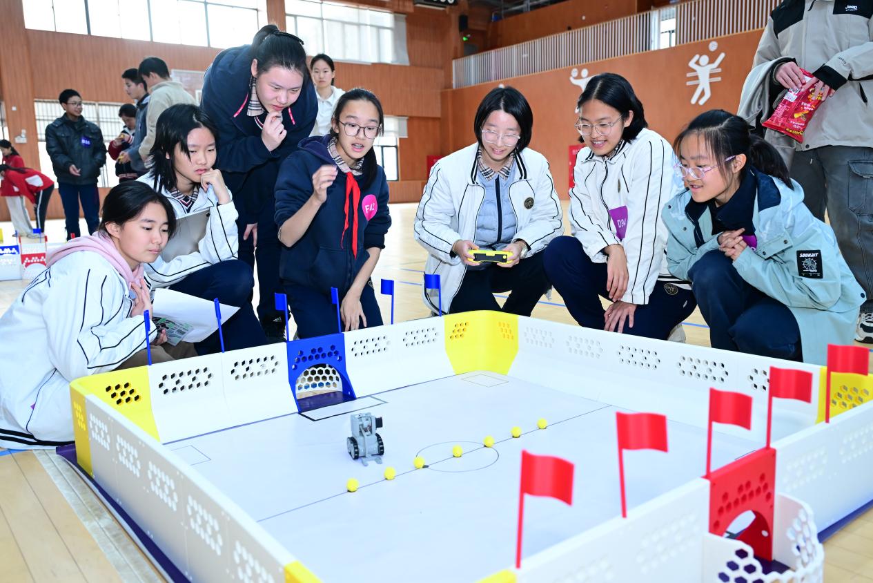 参赛学生通过现场组装搭建、编程、比赛对决等形式,组队完成编程调试优化、抓取小球等特定任务,并最终操控足球机器人完成小球的弹射。