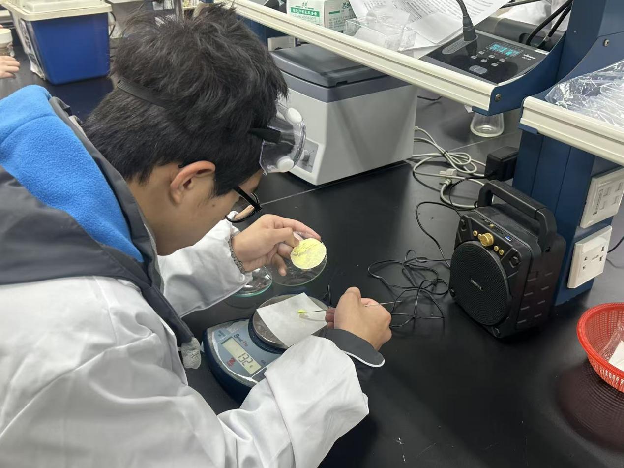 随后,同学们身穿白大褂,在老师细致的示范指导下,开启了一场别开生面的“追光之旅”。从药品的精确称量、混合加热,再到将试剂逐滴滴入茄形瓶,溶液中逐渐析出黄色的沉淀。大家严格遵循步骤进行冷凝与抽滤操作,最终制得稀土铕配合物。当紫外线灯亮起,样品瞬间绽放出夺目的荧光,如一抹暗夜中的红色星火。