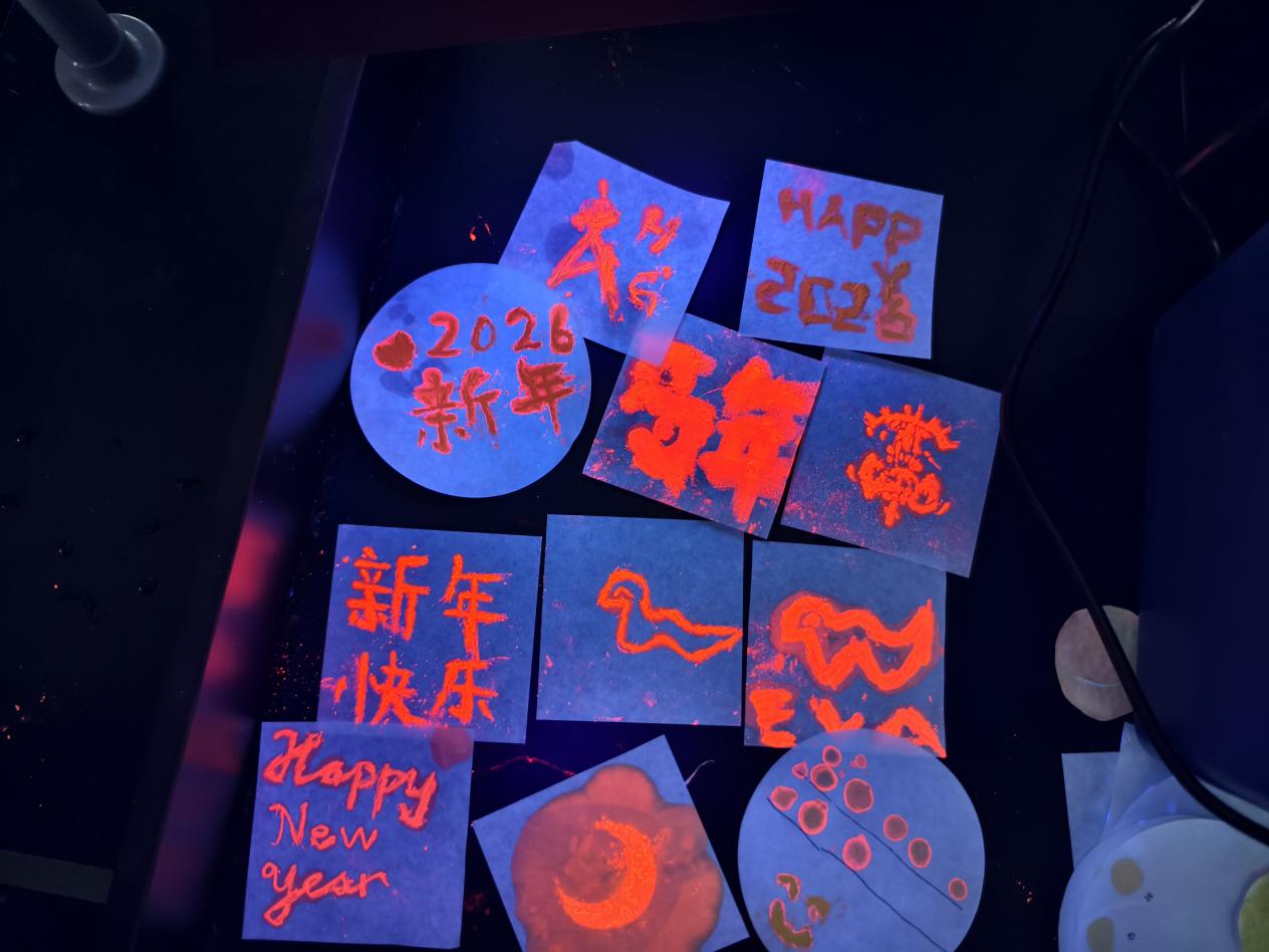 从严谨的称量到荧光的绚烂绽放,同学们不仅在实践中体会到化学的理性与精确,更在创意的延伸中激发出探索与创新的思维。紫外灯下每一次荧光的点亮,都是科学之美的生动诠释,也是实验旅程中难忘的璀璨注脚。
