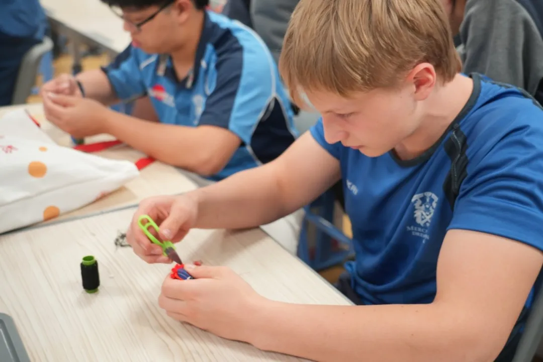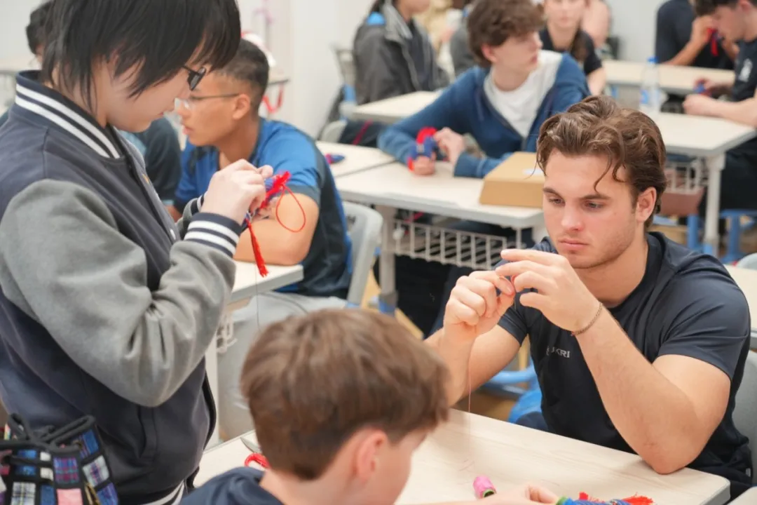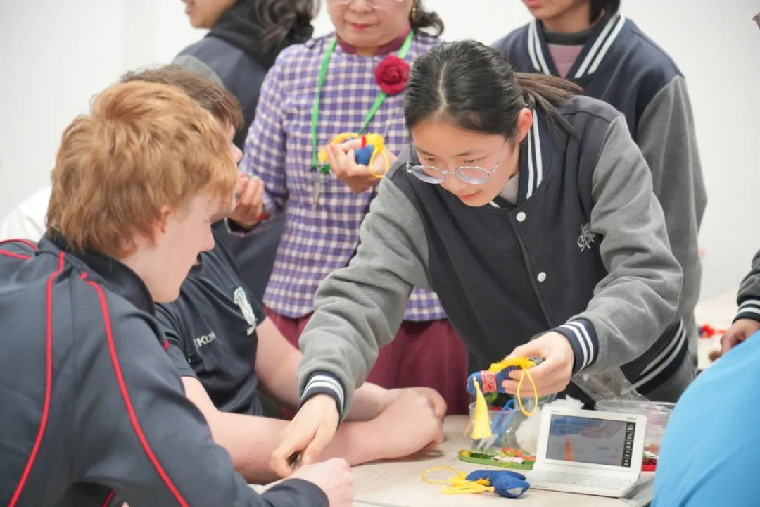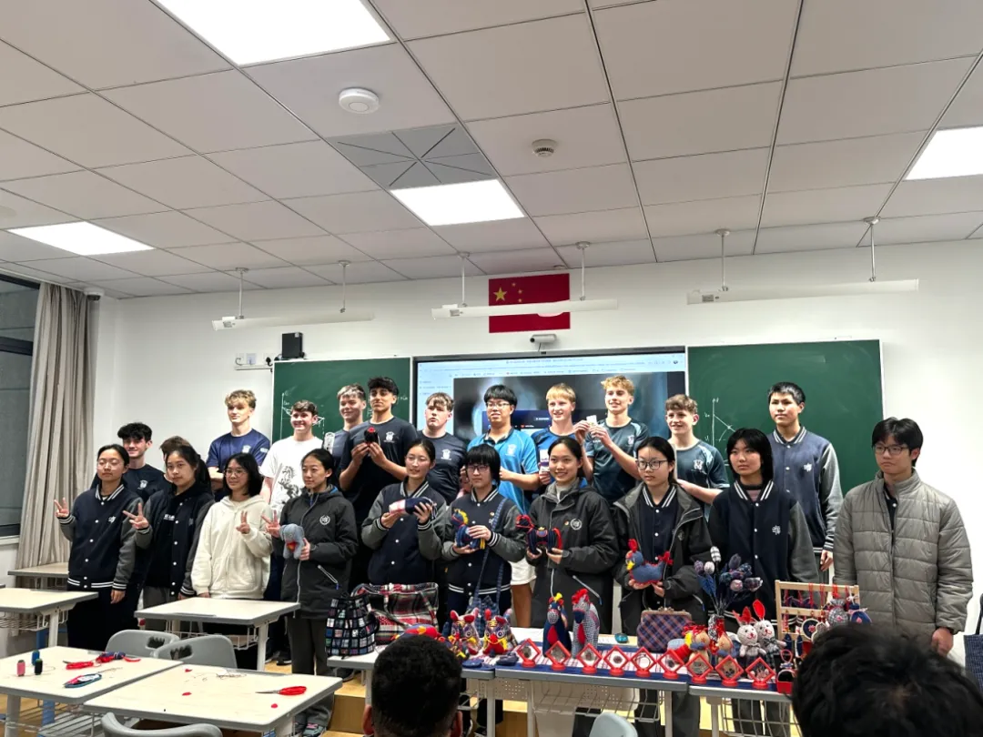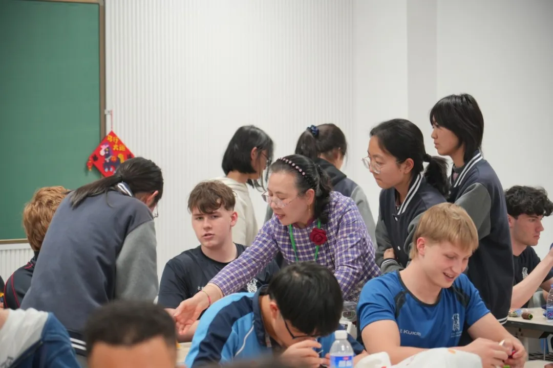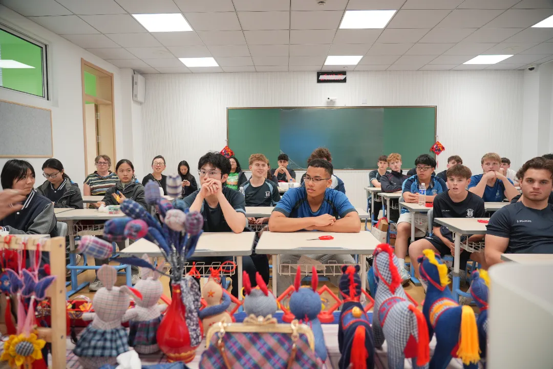 紧接着,我们邀请来访师生体验了我校的特色选修课程——三林标布。课程伊始,非遗文化传承人刘佩玉老师向友人们介绍了三林标布这一项兼具艺术性与实用性的传统技艺。随后,在刘老师的指导下,11名FFF学子作为讲解员和翻译官,与英国师生分小组共同完成了小马挂饰的制作。每位友人都亲手制成了一件马形挂饰,其"马到成功"的寓意更是凝聚着中华民族传统的底色和我校全体师生对国际友人的真挚祝福。