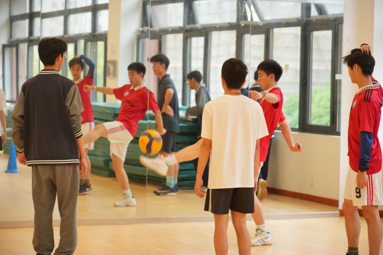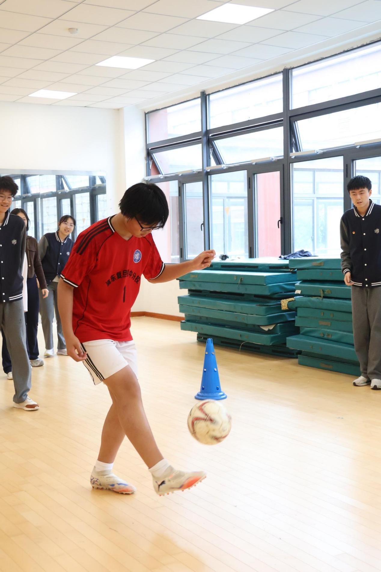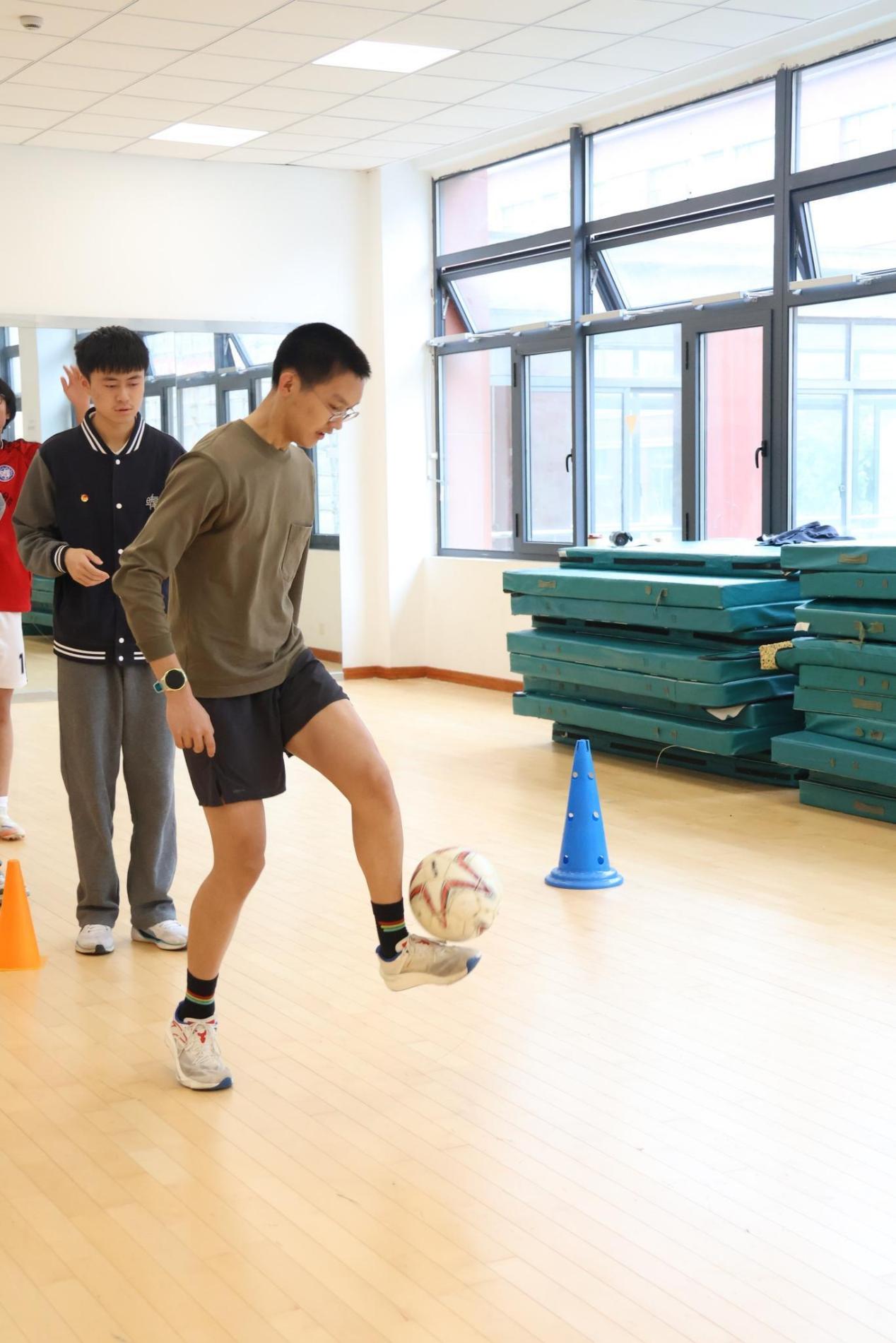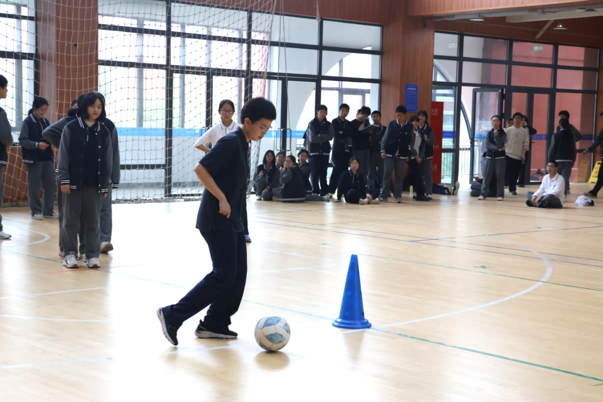 与紧张刺激的竞技赛同步进行的,是面向全体学生的四大趣味足球项目。无论是在室外篮球场进行的“定点射门挑战”和“足球保龄球”,还是在室内体育馆进行的“带球绕桩竞速”和“班级颠球比赛”,各个场地上都充满了欢声笑语。·